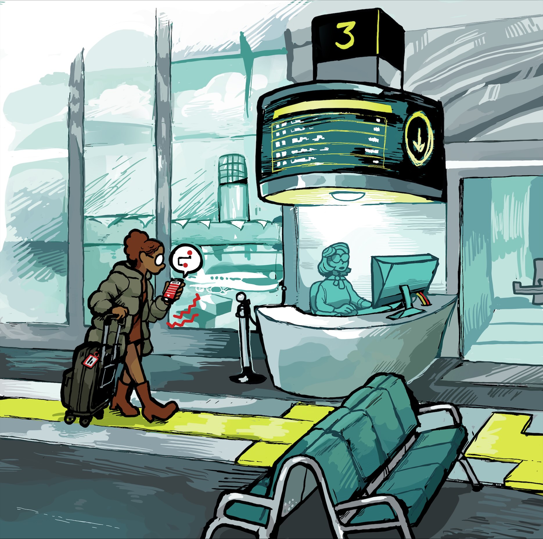 A visually impaired Black woman uses an accessible navigation app on her phone, which vibrates as she reaches her airport terminal. The woman wears glasses and pulls a suitcase with her right hand. She is following a path paved with tactile tiles. In the background, a customer service person sits at the terminal kiosk and an airplane apron is visible through large windows.