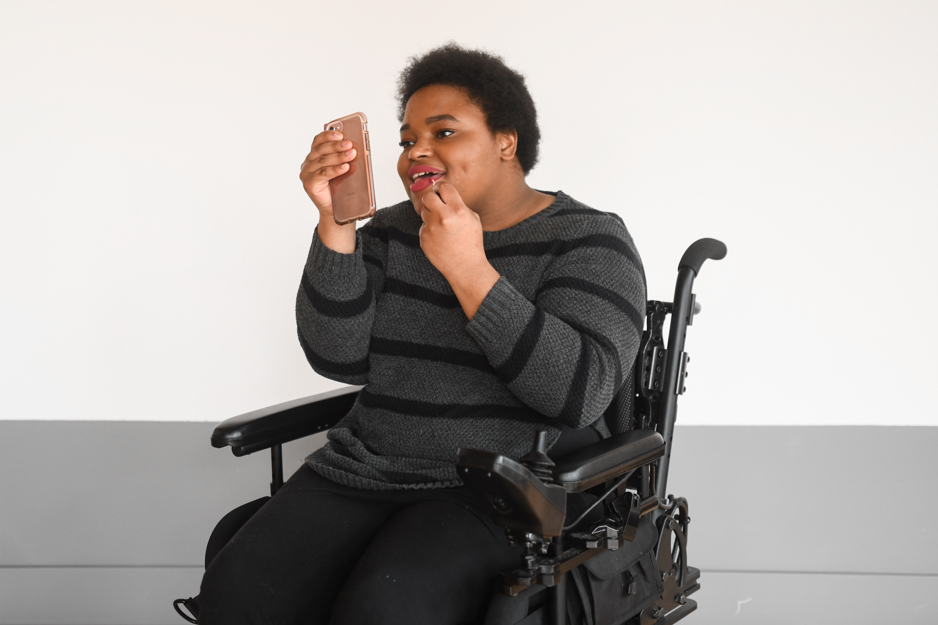 Torso crop of a Black non-binary person applying pink lip gloss by using their pink cell phone as a mirror. They are sitting in a power wheelchair and in front of a white wall with a gray stripe.