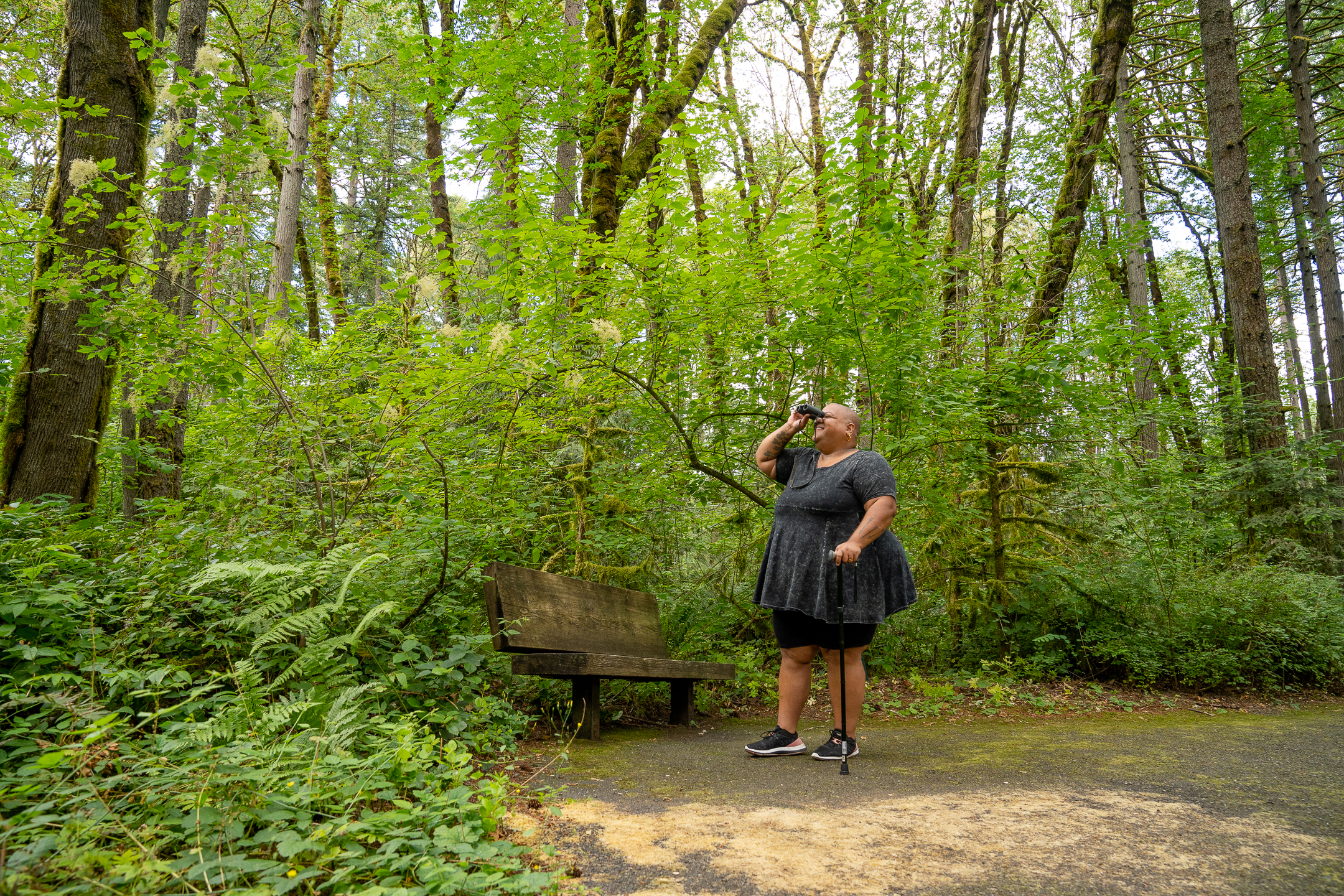 Wide shot of a Black non-binary hiker looking up and grinning at the bird they spot in the midst of a lush forest. One hand is on their cane while the other supports their binoculars. The hiker has a shaved head and wears glasses, a peplum shirt, shorts, and tennis shoes.