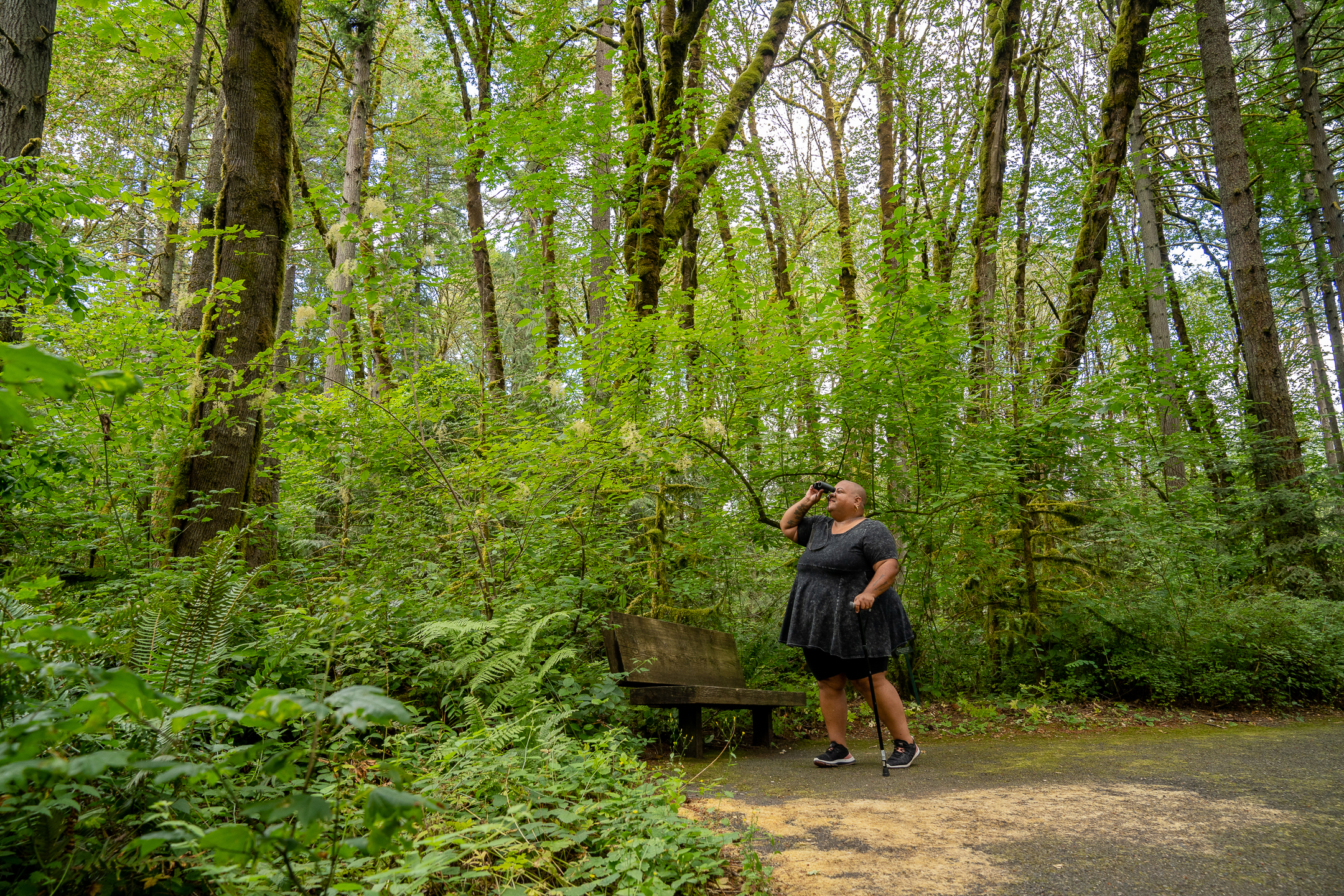 Wide shot of a Black non-binary hiker using binoculars to scan for birds in the midst of a lush forest. The hiker has a shaved head and their binocular-free hand on their cane. They wear glasses, a peplum shirt, shorts, and tennis shoes.