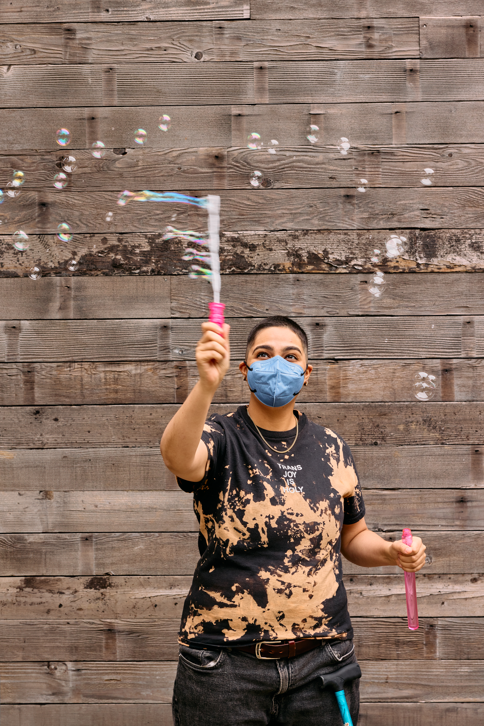 A masked non-binary Latinx person waves a bubble wand in front of a wood panel wall. They look joyfully at the surrounding bubbles above them and wear a patterned shirt reading, “Trans joy is holy.” A teal cane leans against them, though only the top of it is in frame.