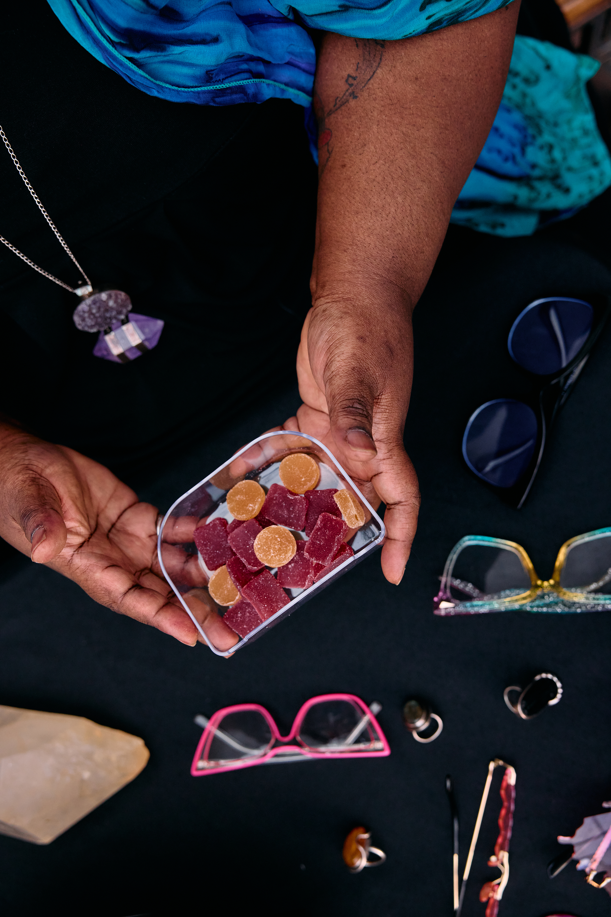 An overhead cropped shot shows the hands of a Black woman holding a container filled with CBD gummies. She is sitting at a table strewn with rings and eyeglasses.