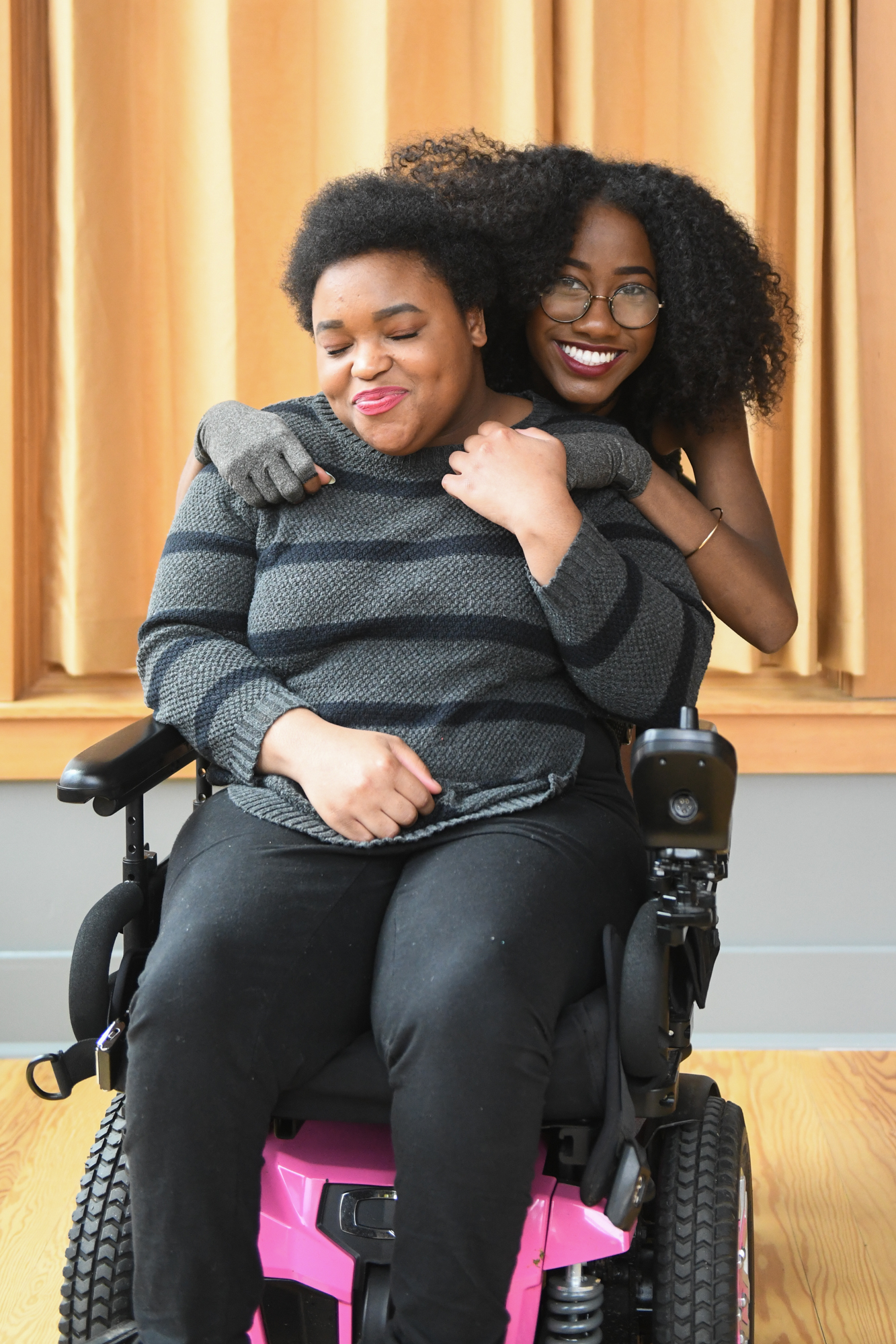 A Black non-binary person in a black and pink power wheelchair has their eyes closed and is smiling while being hugged from behind by a Black femme wearing compression gloves. The two have their hair tangled together from the embrace.
