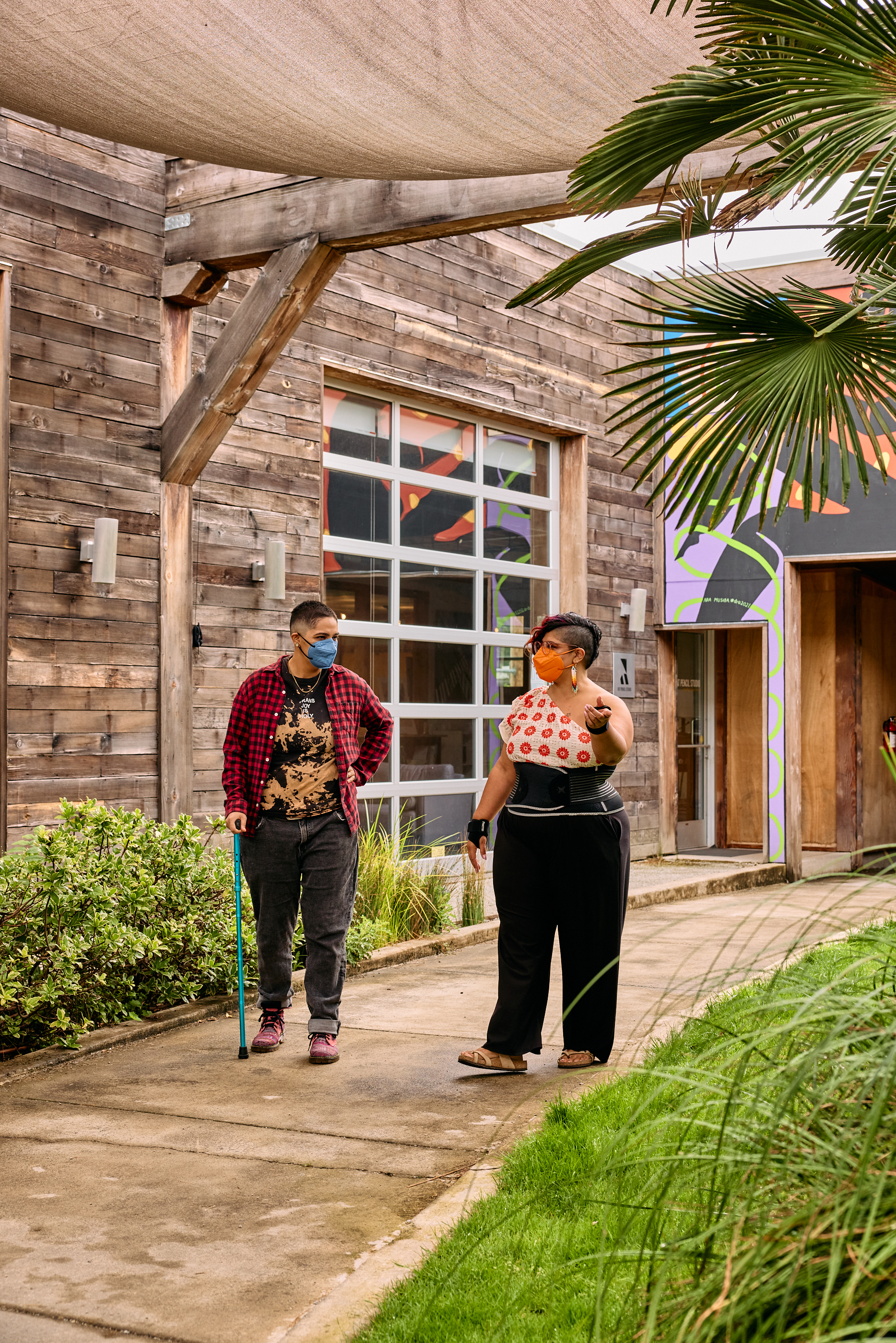 Two masked disabled people of color chat and walk through a lush outdoor courtyard. On the left, a Latinx non-binary person looks toward their friend as they step forward with their teal cane. On the right, an Indigenous woman gestures with her hands, which are wrapped in wrist support braces. She has a faux hawk, Native beaded earrings, and waist trainers resembling an intricately stitched corset.