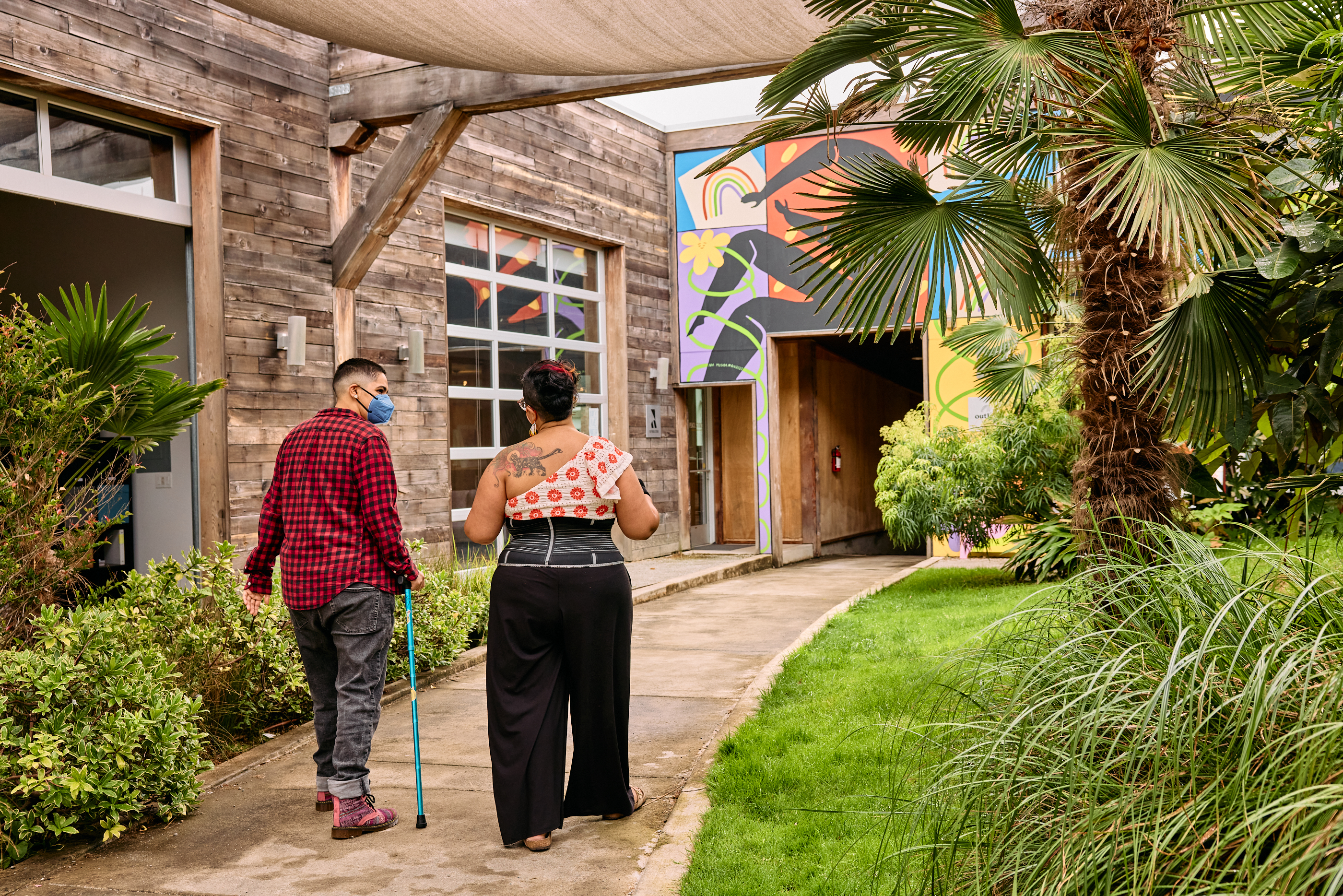 Two masked disabled people of color chat and walk through a lush outdoor courtyard, photographed from the back. On the left, a Latinx non-binary person looks toward their friend as they step forward with their teal cane. On the right, an Indigenous woman gestures with her hands, her waist trainers resembling an intricately stitched corset.