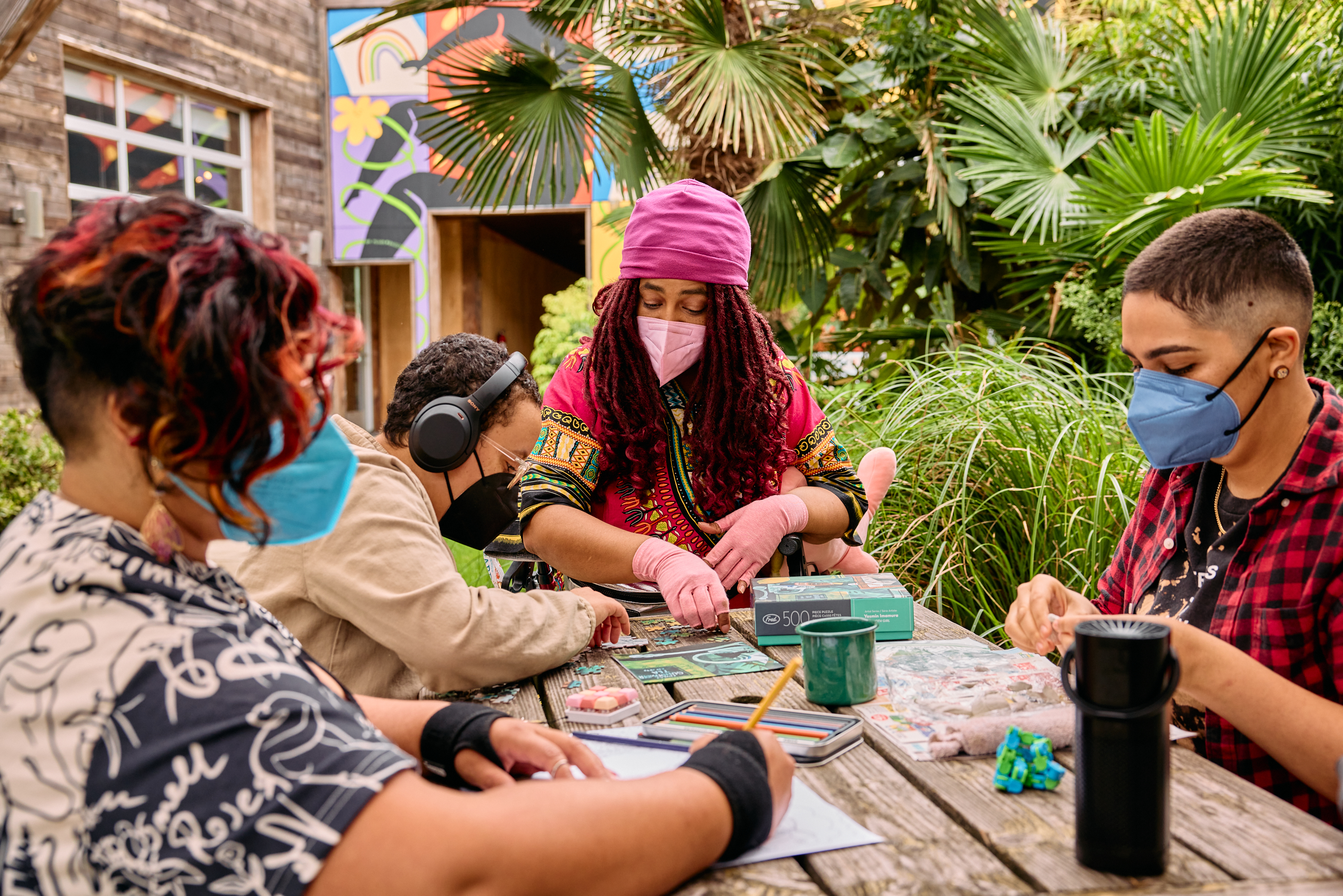 Four masked disabled people of color sit at a table outdoors, immersed in arts and crafts. Two people are working on a puzzle, one wearing arthritis gloves and the other with noise-canceling headphones. One person is shaping modeling clay, and one person is filling in a coloring book while wearing wrist support wraps. Two stim fidgets rest on the table, and a portable air purifier can be seen in the foreground to the right.