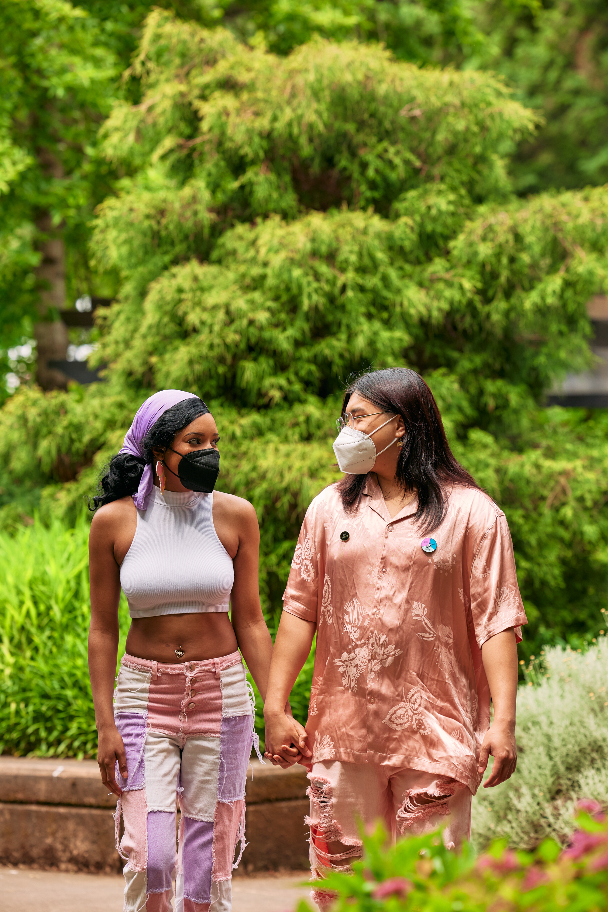 Portrait shot of a young masked autistic couple (a Black woman and non-binary Asian person) gazing at each other and holding hands on a park date. The couple has coordinating colors on, with the non-binary person in champagne pink, and the woman in lavender, white, and pastel pink.