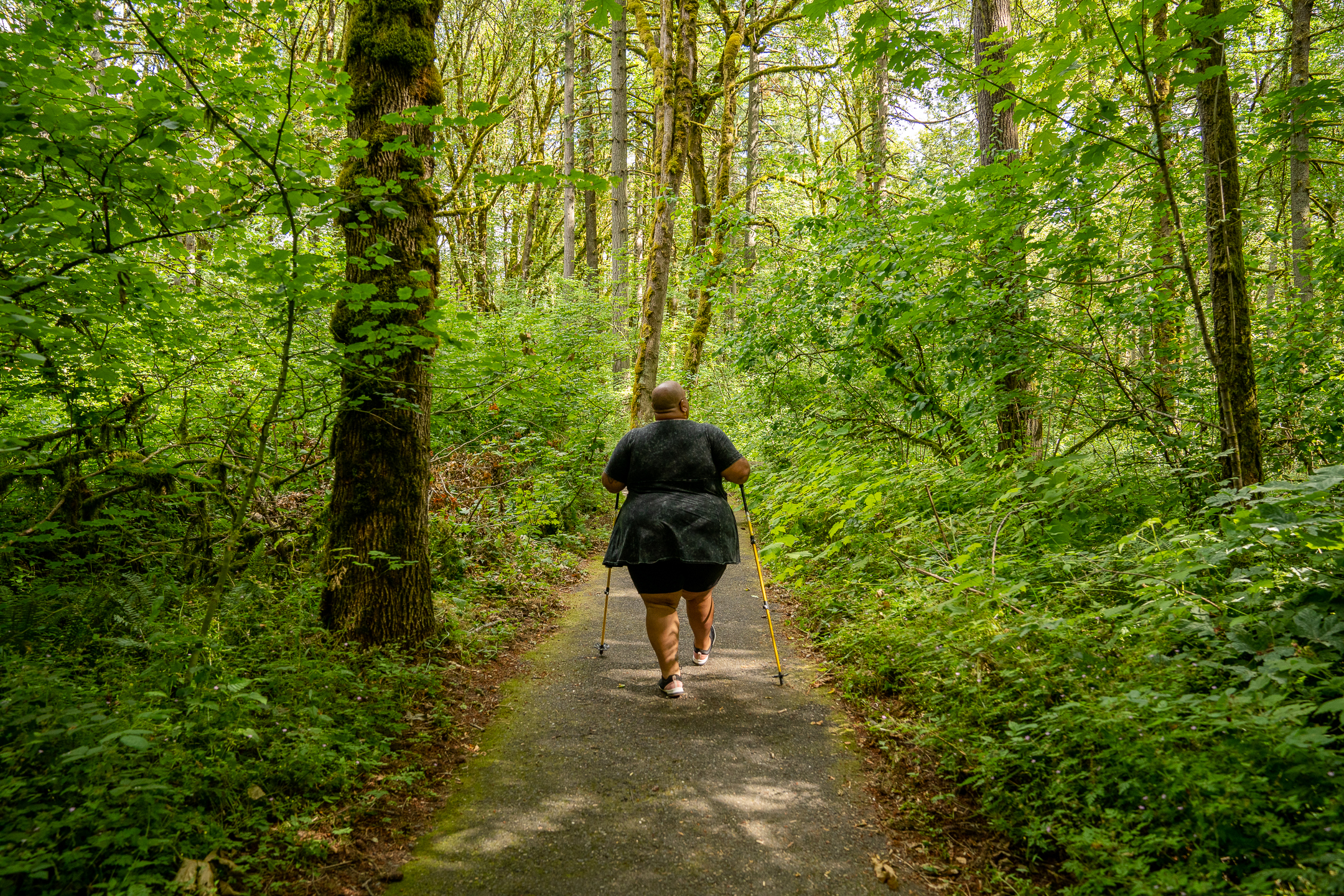 Wide back shot of a disabled Black non-binary hiker entering a forest with trekking poles via an accessible paved trail. They are surrounded by lush greenery, with sunlight peeking through the back of the visible path.