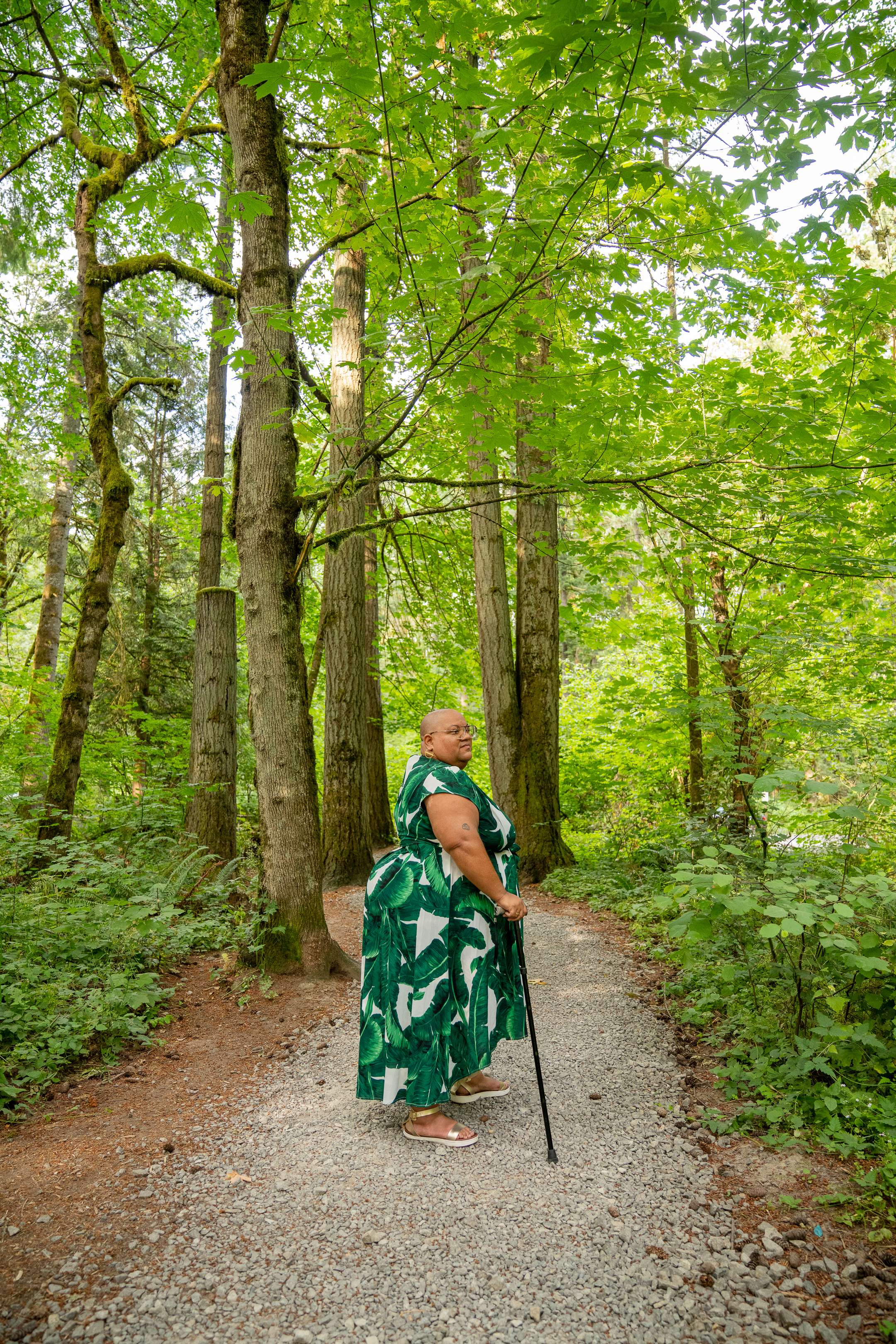 Side portrait shot of a Black non-binary person standing regally in a rocky forest grove with their cane, their shaved head framed by lush greenery that gives the illusion of a headpiece. They wear glasses, a long flowing leaf print dress, and gold sandals.