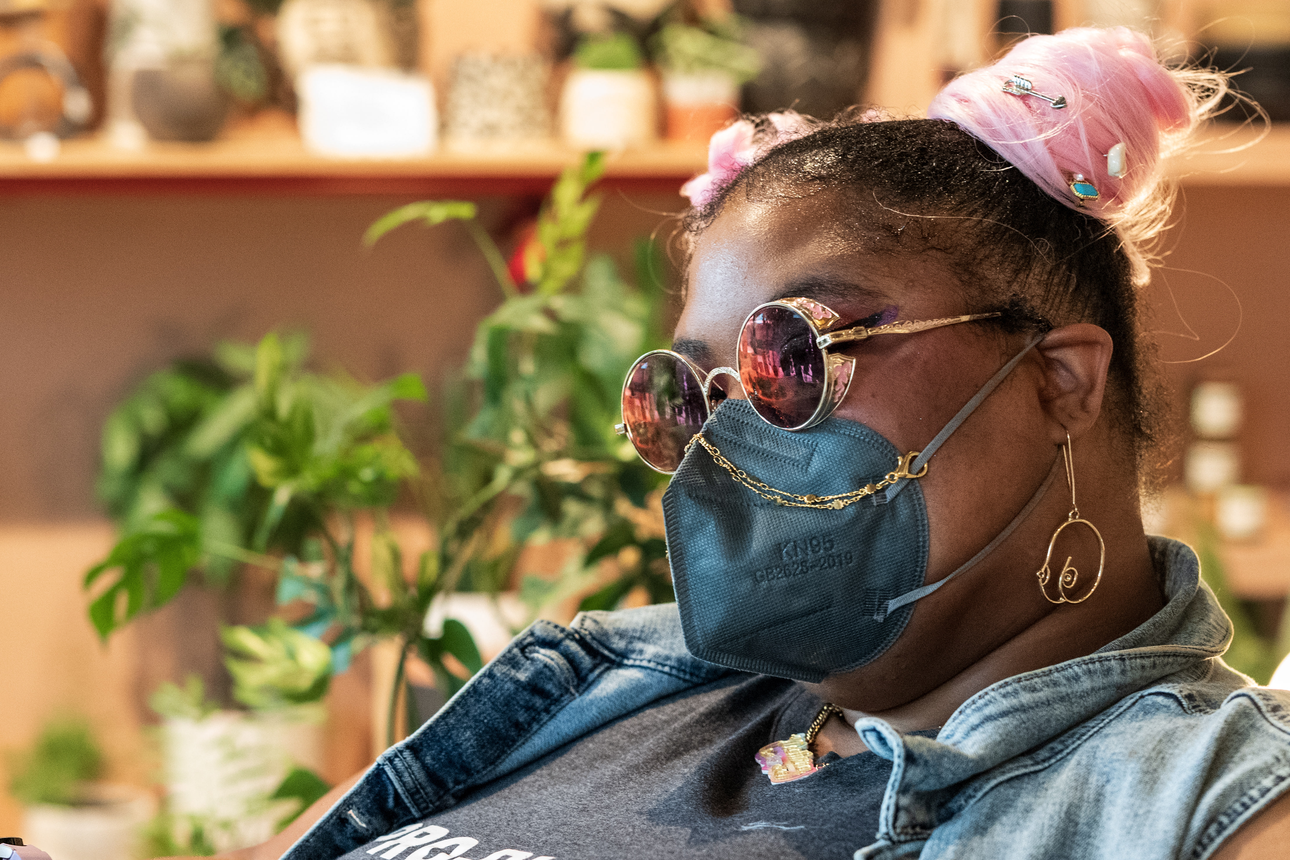 Side profile close-up of a non-binary Black person wearing a KN-95 mask adorned by a gold double chain. Their look also features pink space buns, a dangling gold earring of abstract breasts, and a denim vest.