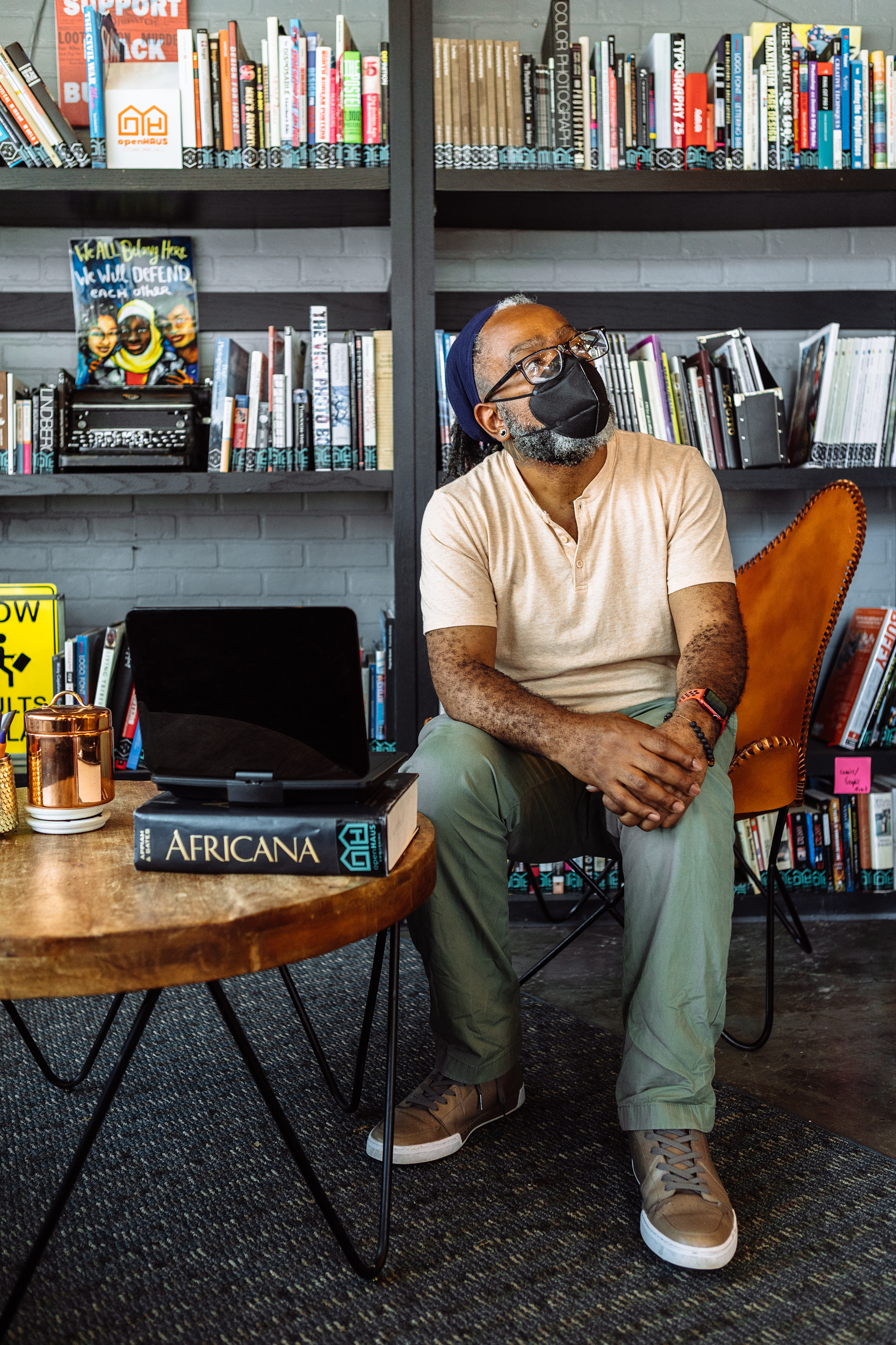 A Black man wearing glasses and a KN-95 mask looks off to the side while sitting at a coffee table in a community library filled with books and social justice prints. The man is next to an open laptop propped on top of an Africana encyclopedia.