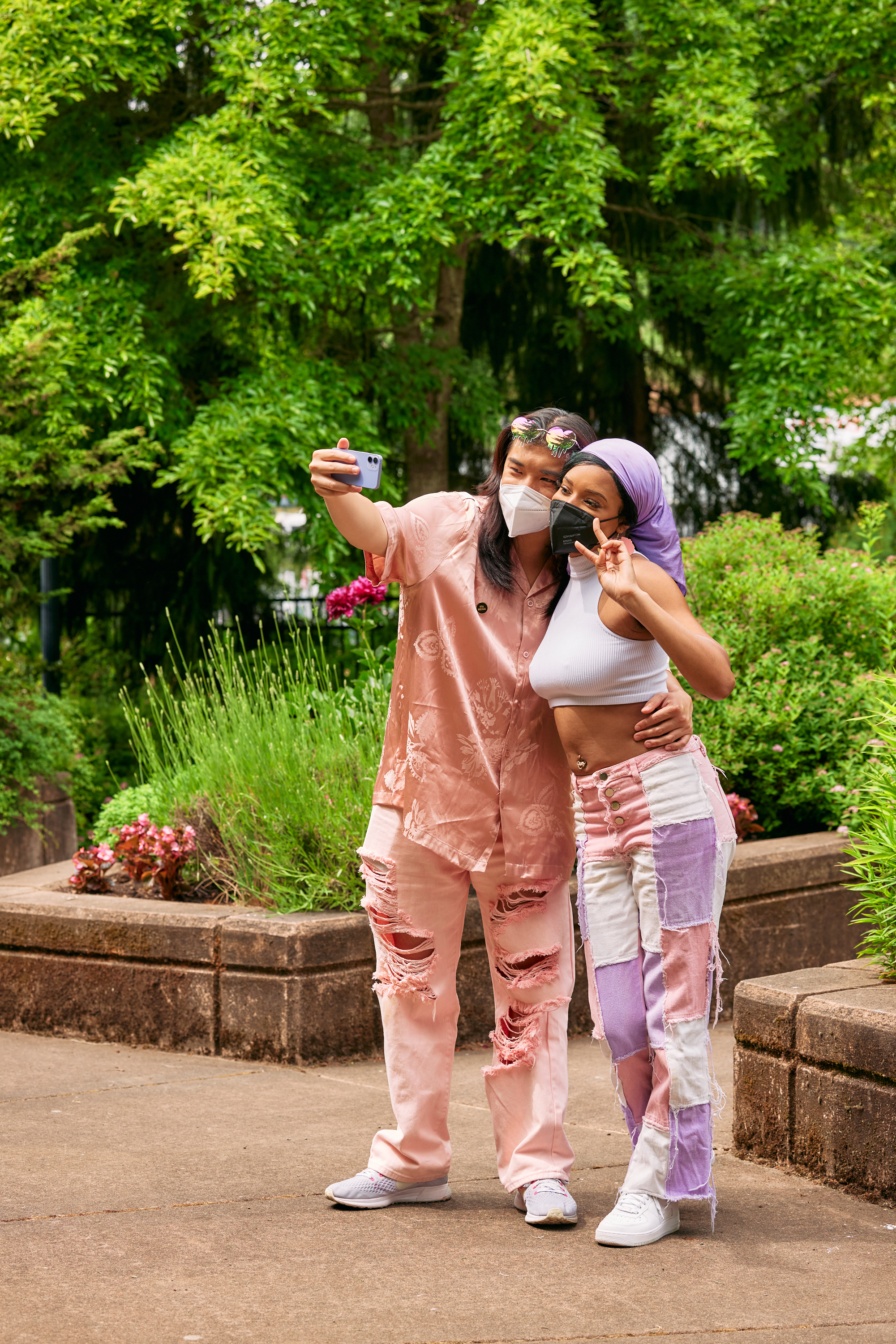 Portrait shot of a young masked autistic couple taking a selfie at a lush park with raised garden beds. On the left, the non-binary Asian person holds up a lavendar phone with one hand and wraps their free arm around their partner’s waist. On the right, the Black woman leans into her partner and poses with a peace sign. The couple has coordinating colors on, with the non-binary person in champagne pink, and the woman in lavender, white, and pastel pink.