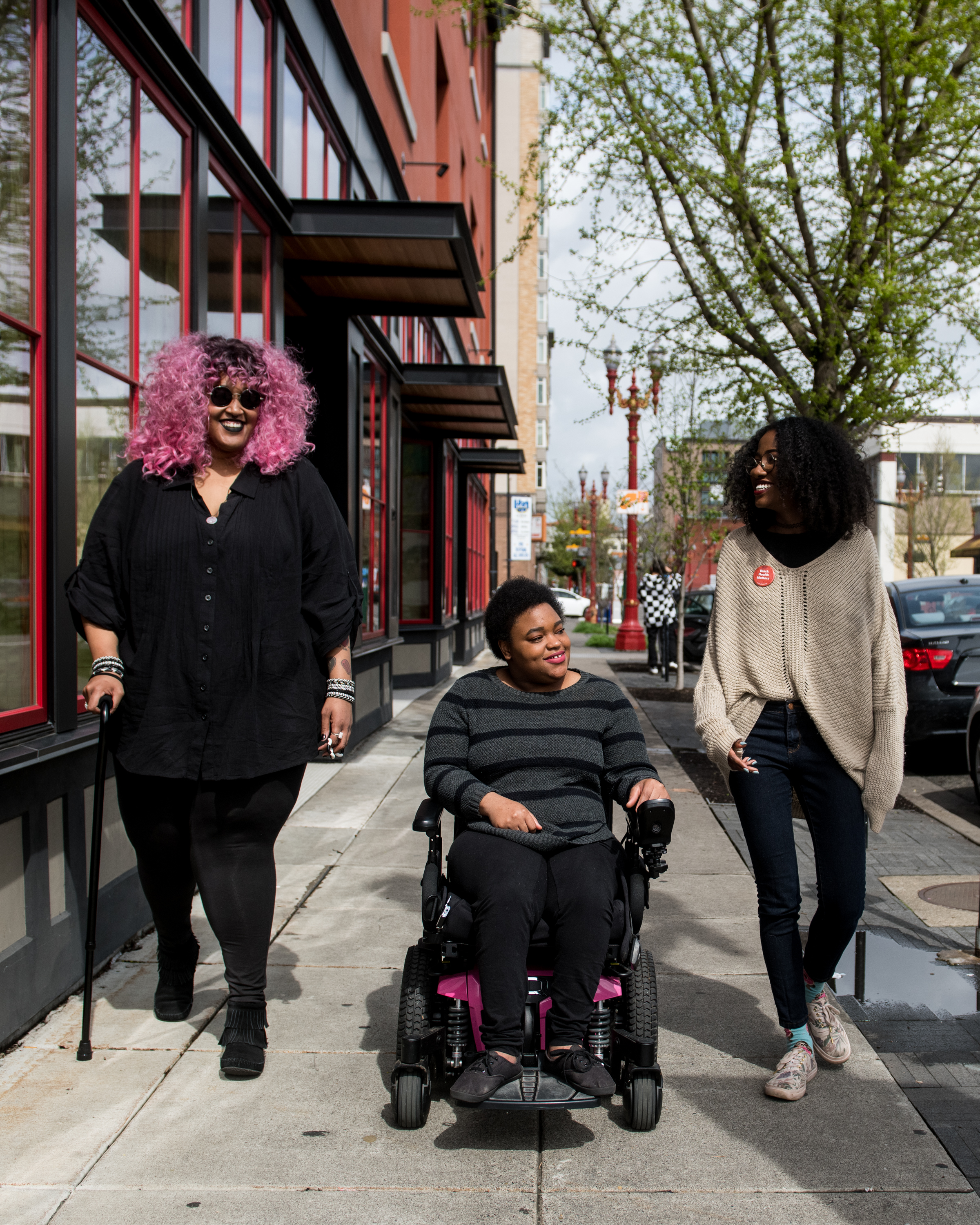 Three Black and disabled folx smile and stroll down a sidewalk side by side. On the left, a non-binary person walks with a cane in one hand and a tangle stim toy in the other. In the middle, a non-binary person rolls along in their power wheelchair. On the right, a femme gestures mid-walk.