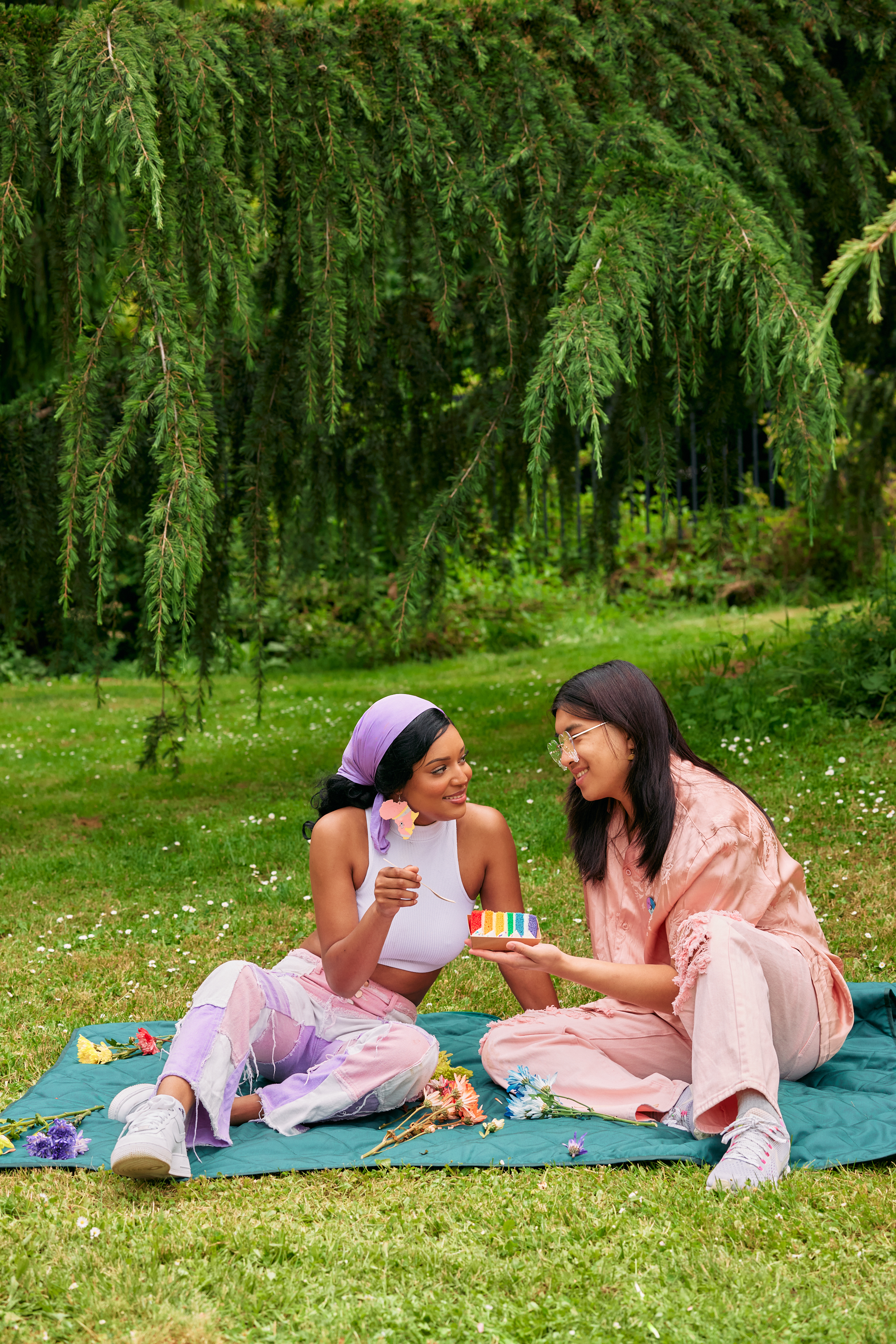 Portrait shot of a young autistic couple smiling at each over a slice of rainbow cake on a picnic park date. On the left, the Black woman is in lavender, white, and pastel pink. On the right, the non-binary Asian person is in champagne pink.