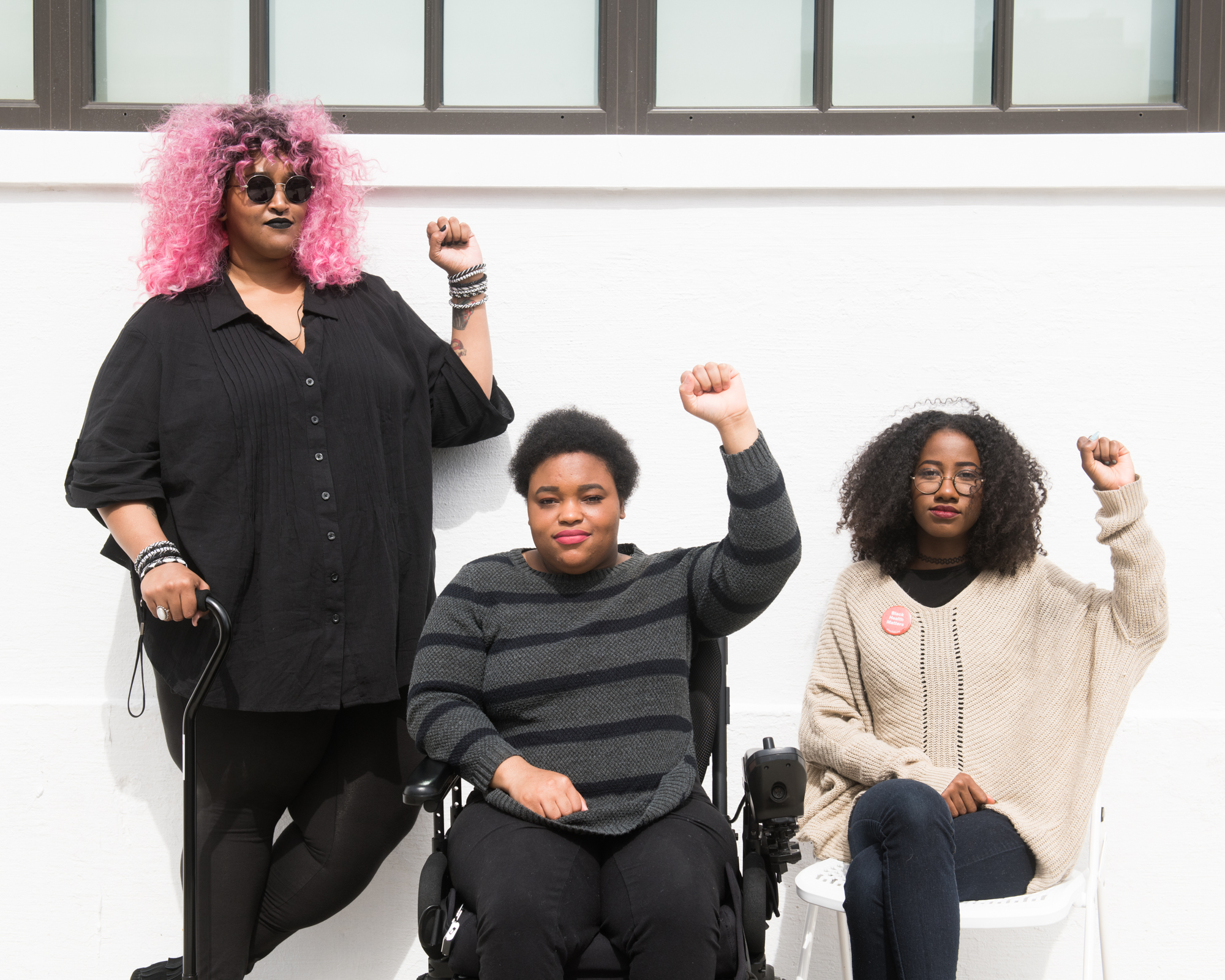Torso level photo of three Black and disabled folx (a non-binary person holding a cane, a non-binary person in a power wheelchair, and a femme on a folding chair) raising their fists on the sidewalk in front of a white wall.