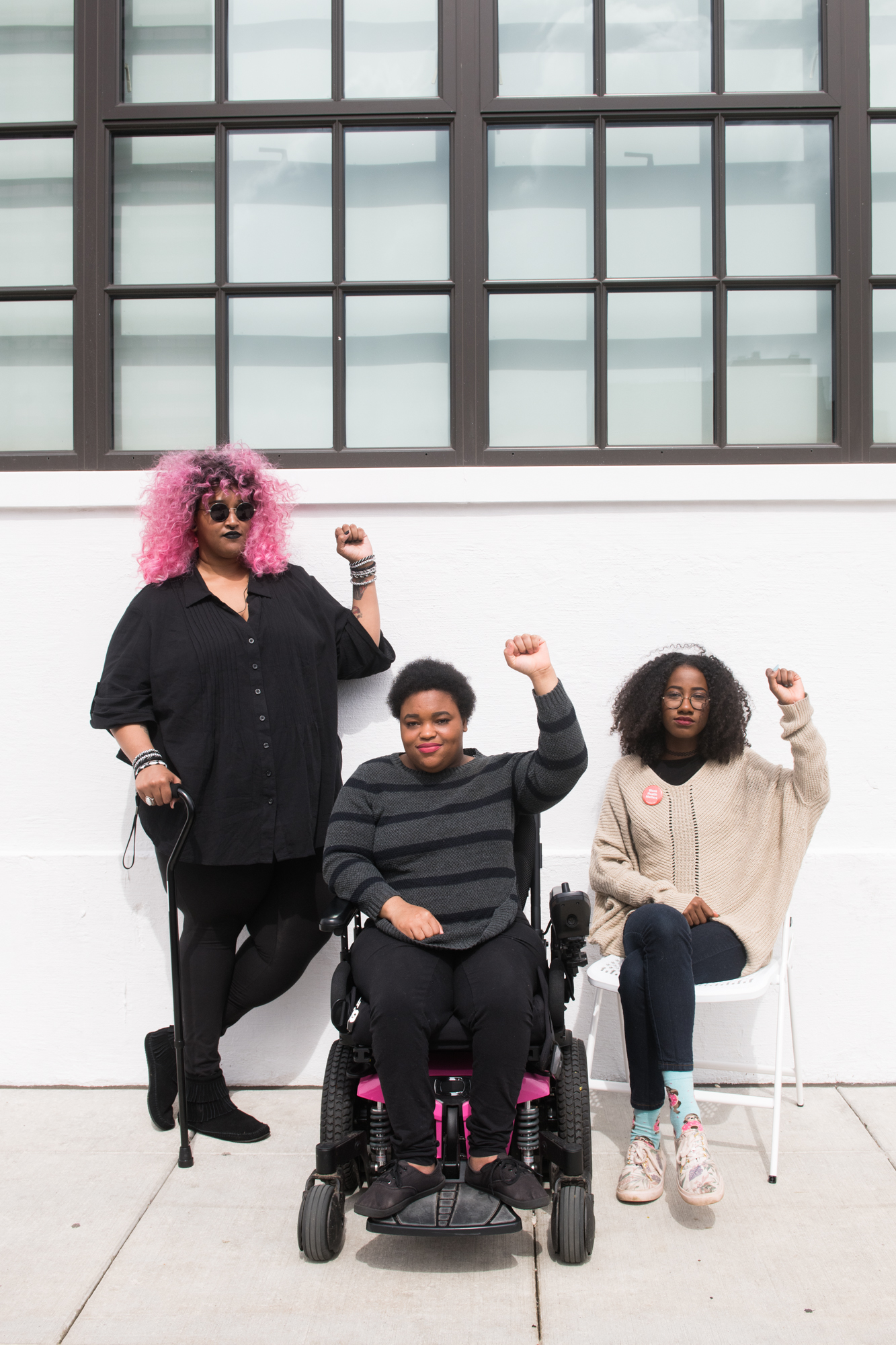Three Black and disabled folx (a non-binary person holding a cane, a non-binary person in a power wheelchair, and a femme on a folding chair) raise their fists on the sidewalk in front of a white wall.