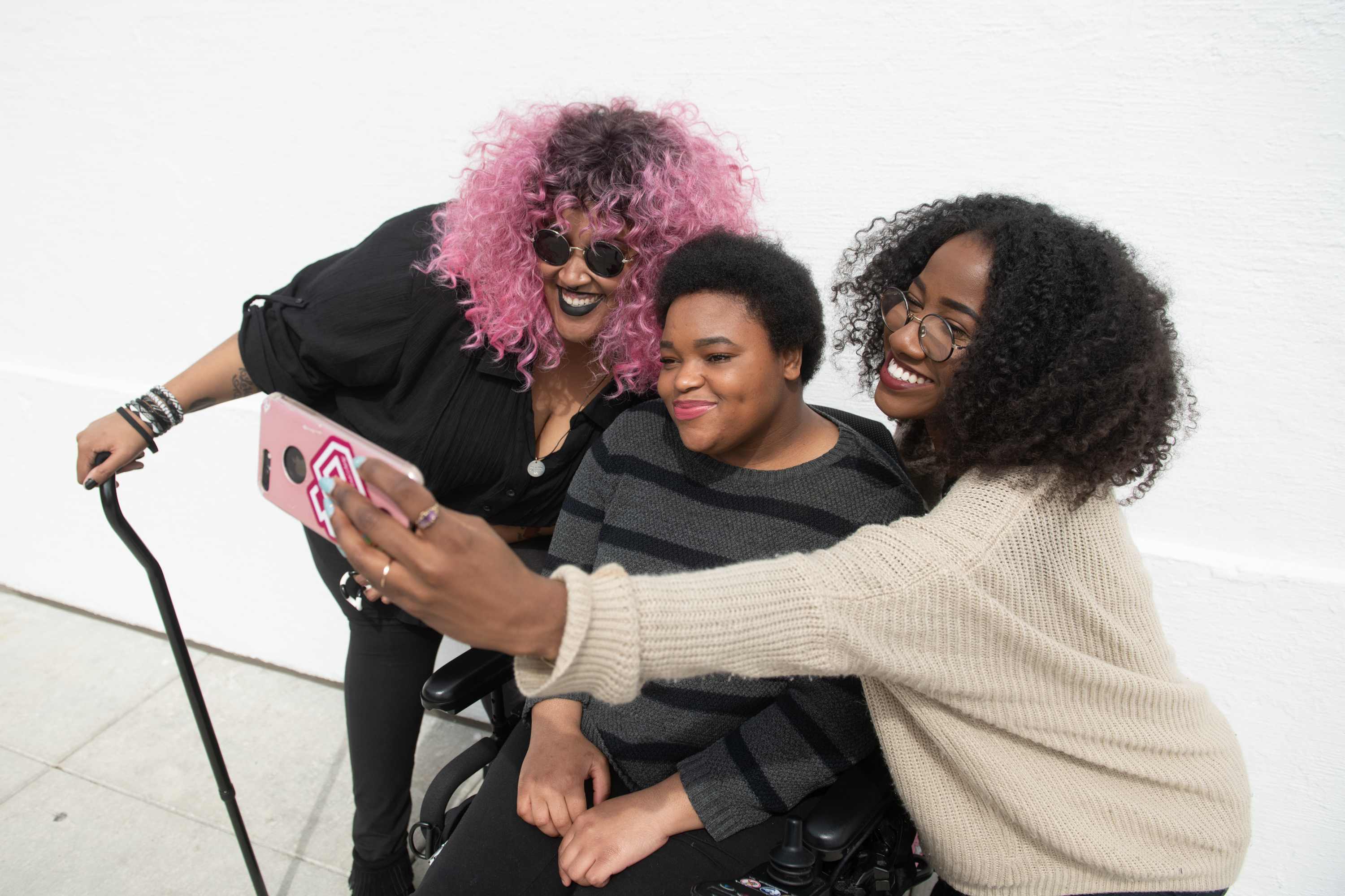 Three Black and disabled friends (a non-binary person with a cane and tangle stim toy, a non-binary person in a power wheelchair, and an invisibly disabled femme) smiling and taking a cell phone selfie together. The photo is angled from the left and cropped around everyone's torso.