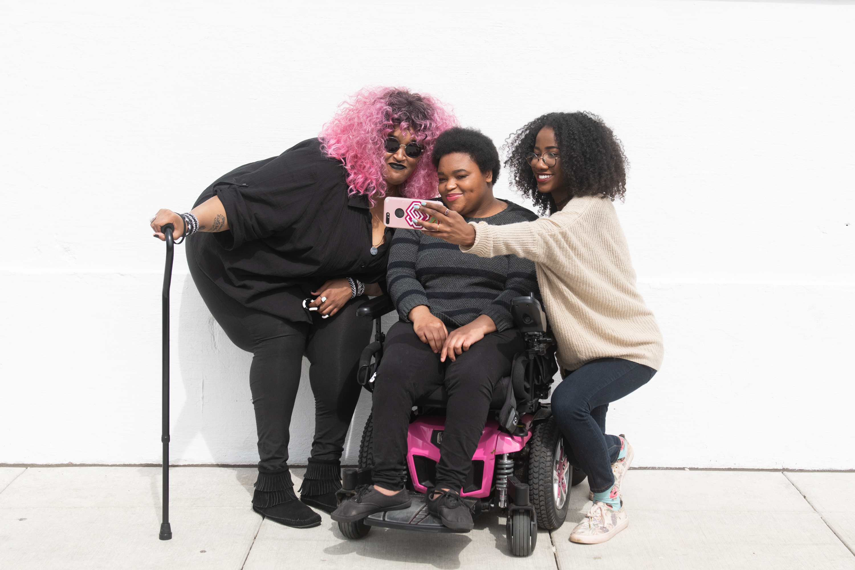 A zoomed out full body shot showing three Black and disabled friends (a non-binary person with a cane and tangle stim toy, a non-binary person sitting in a power wheelchair, and an invisibly disabled femme) smiling and taking a cell phone selfie together. All are outdoors in front of a white wall.