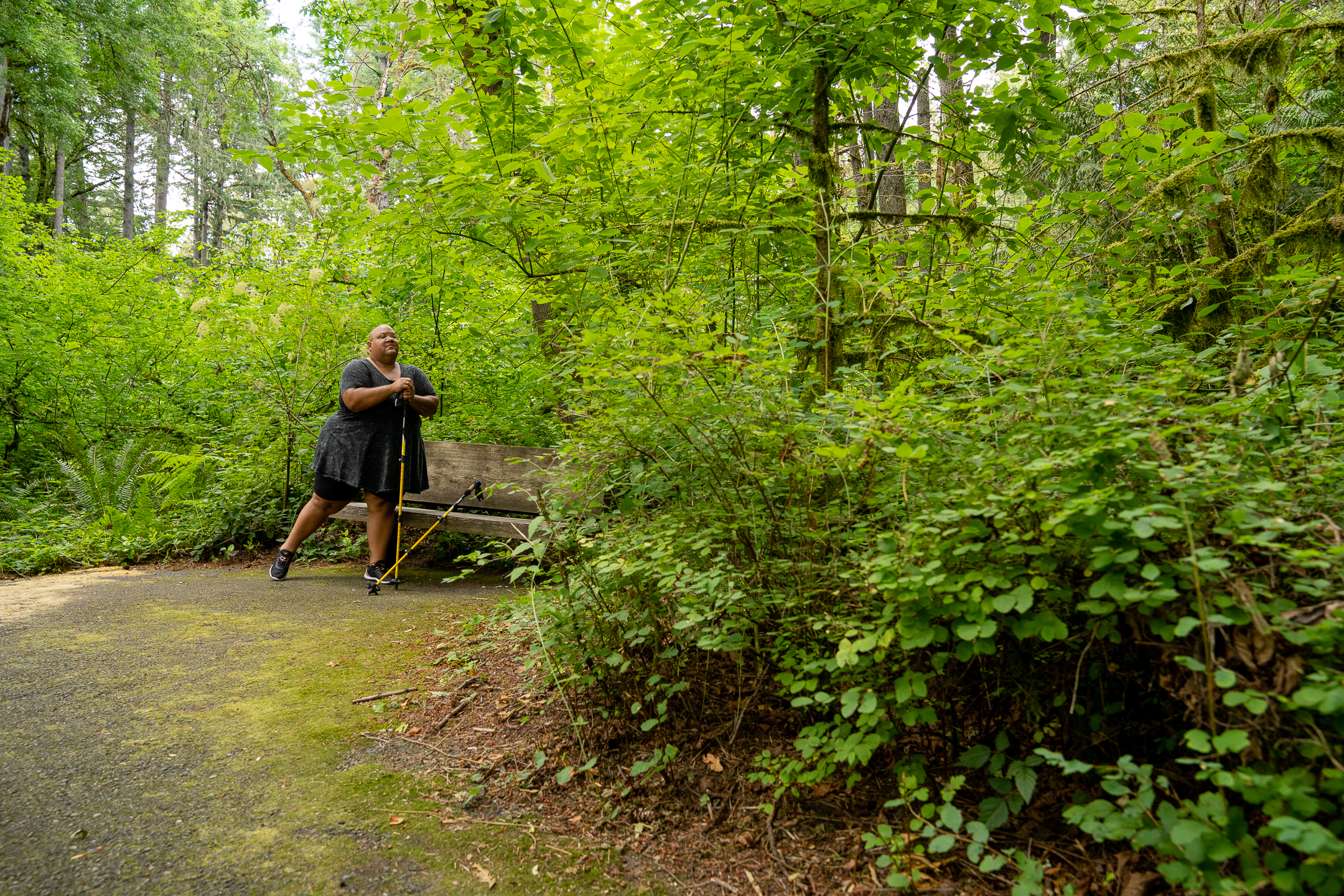 In the middle of a lush green forest, a disabled Black non-binary hiker leans forward on a trekking pole while gently stretching their right leg back. Their other trekking pole rests on the wooden bench behind them. The hiker has a shaved head and wears glasses, a peplum shirt, shorts, and tennis shoes.