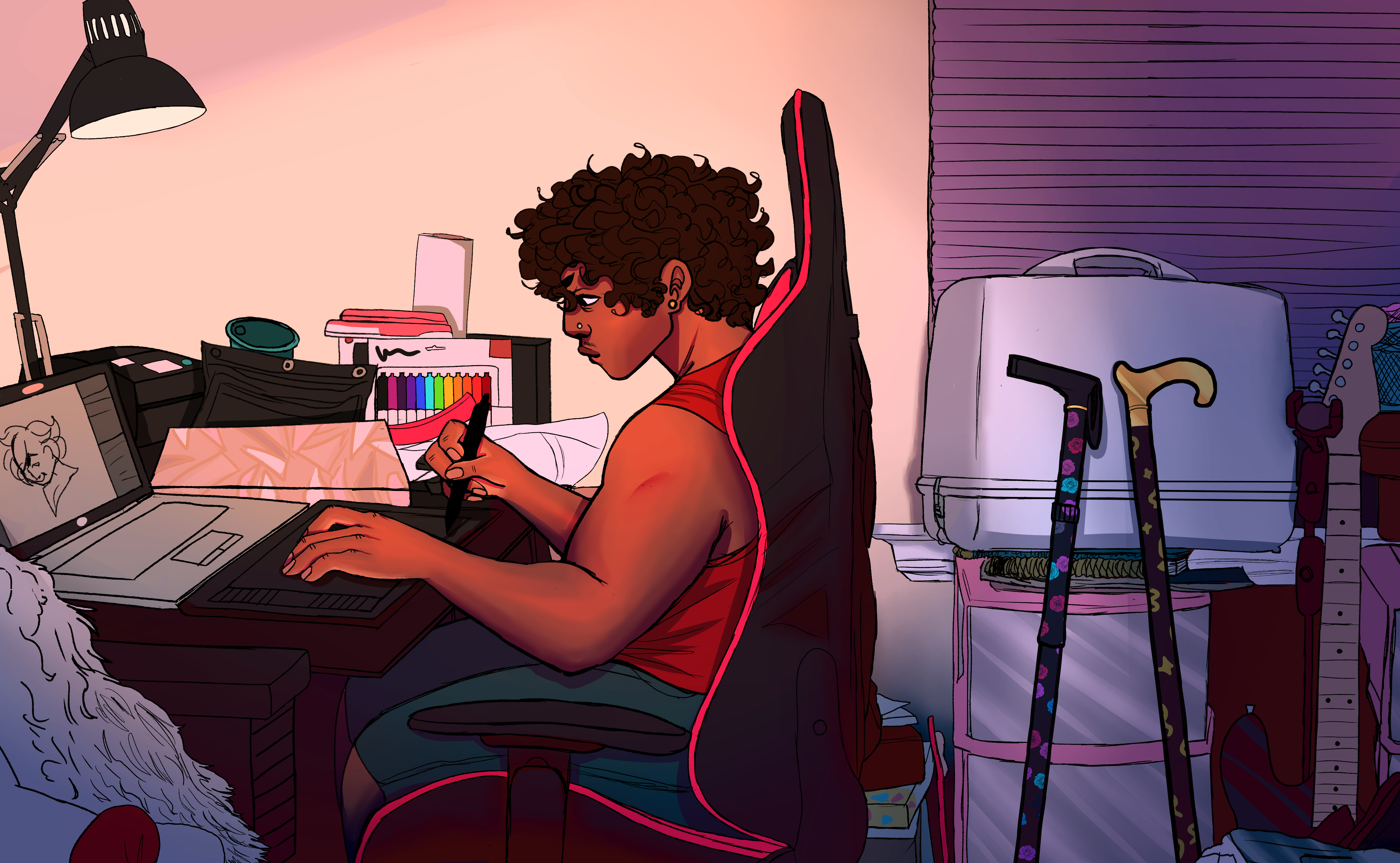 An Afro-Indigenous artist with coily hair sits at his desk, drawing a character on a tablet. His two black canes rest on supply drawers in the background. The left cane is foldable and has a floral pattern. The right cane is a basic sturdy cane with a gold handle and gold squiggles along the body.