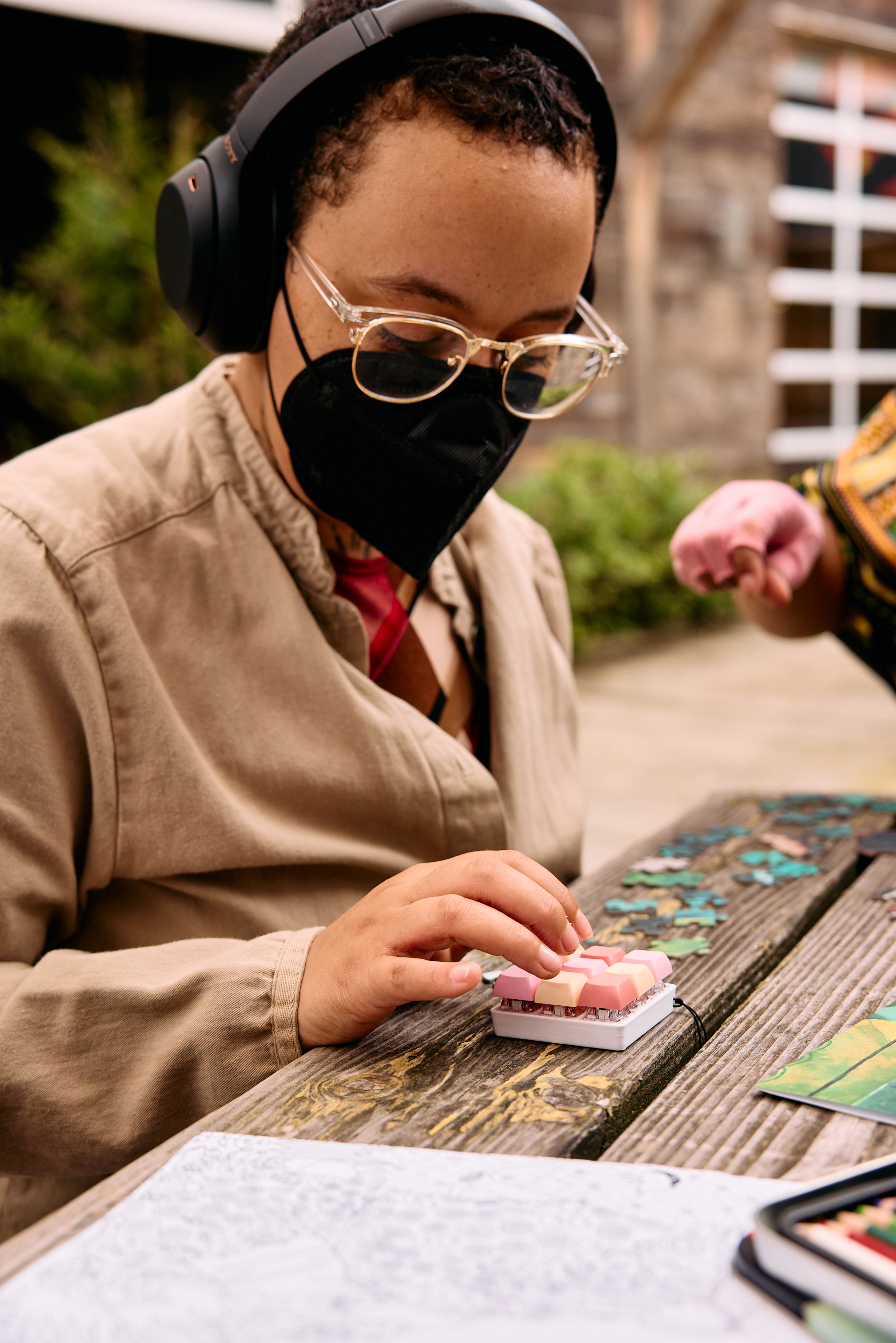 Close-up of a masked non-binary Black person with glasses using their push button fidget clicker while wearing noise-canceling headphones. In the background, arts and crafts supplies are softly out of focus.