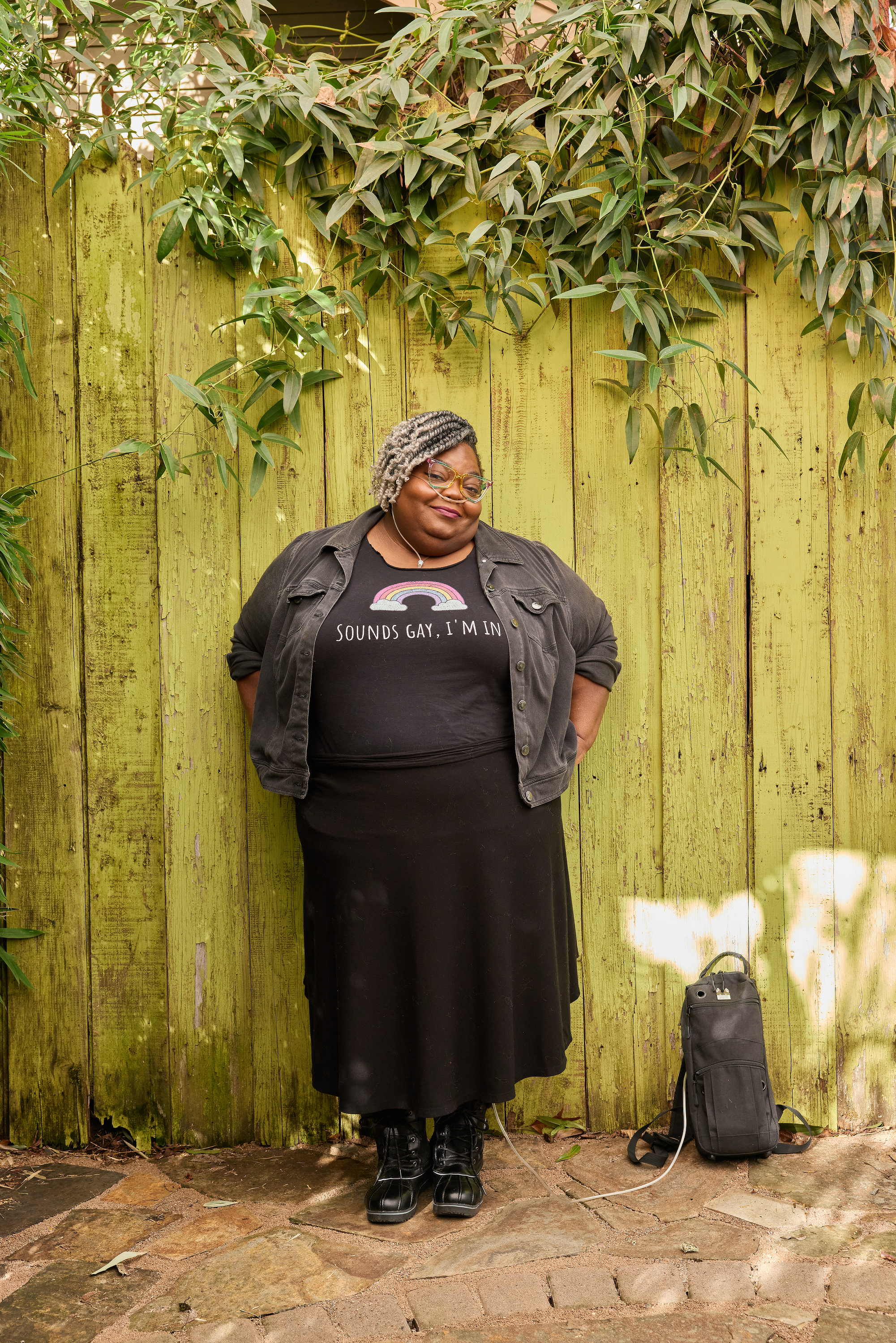 A Black woman in cat eye glasses and a nasal cannula smiles at the camera while standing next to her portable oxygen backpack. She has ombré gray twists and is in an all-black outfit, with a denim jacket, long skirt, boots, and a rainbow shirt declaring, “Sounds gay, I’m in.”