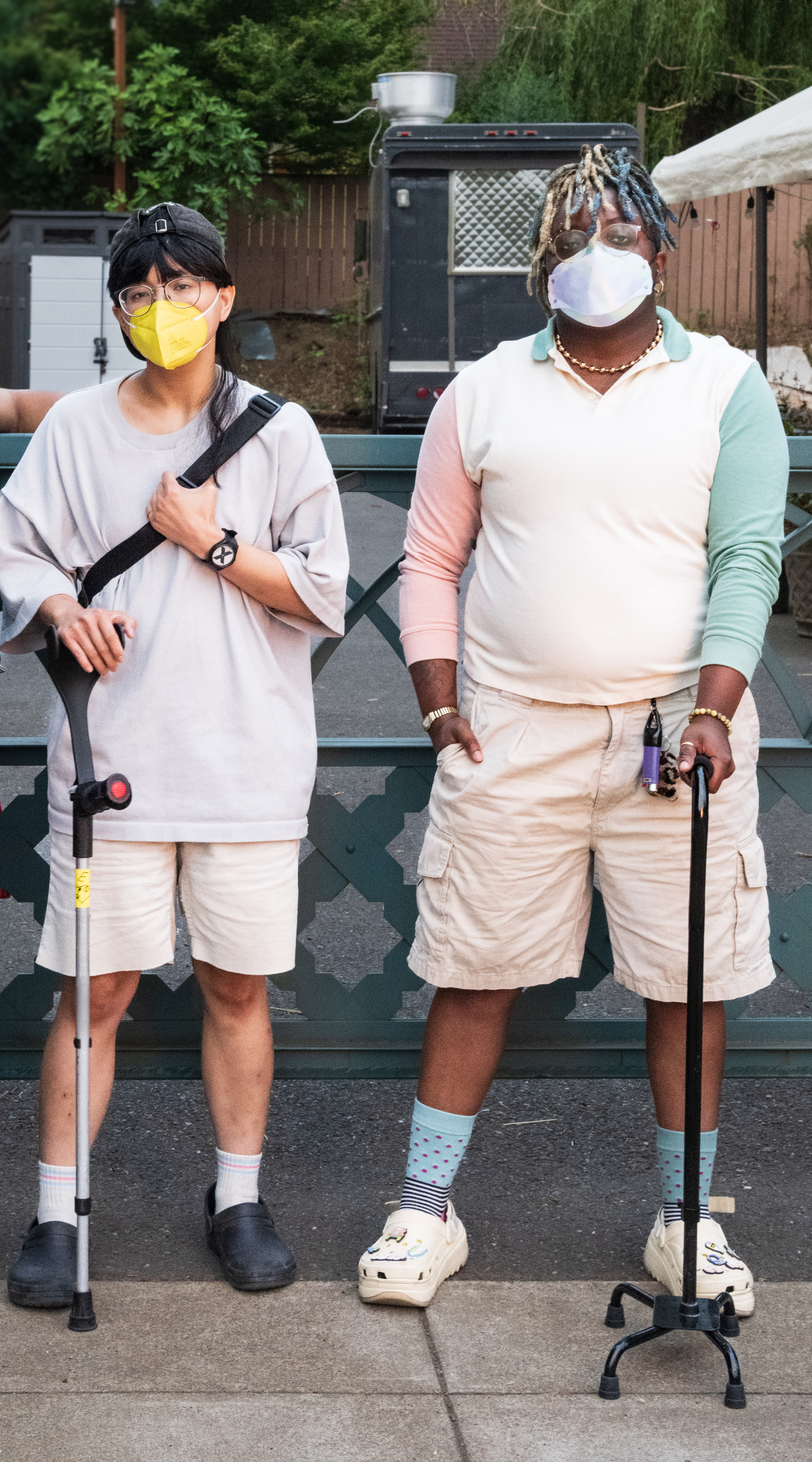 Portrait of a non-binary Filipino person and a transmasculine Black person casually standing on a sidewalk, lit by the warm tones of sunset. Both are dressed in soft muted colors, save for their face masks, which are yellow and holographic rainbow. The Filipino person has a forearm crutch while the Black person is using a quad cane.