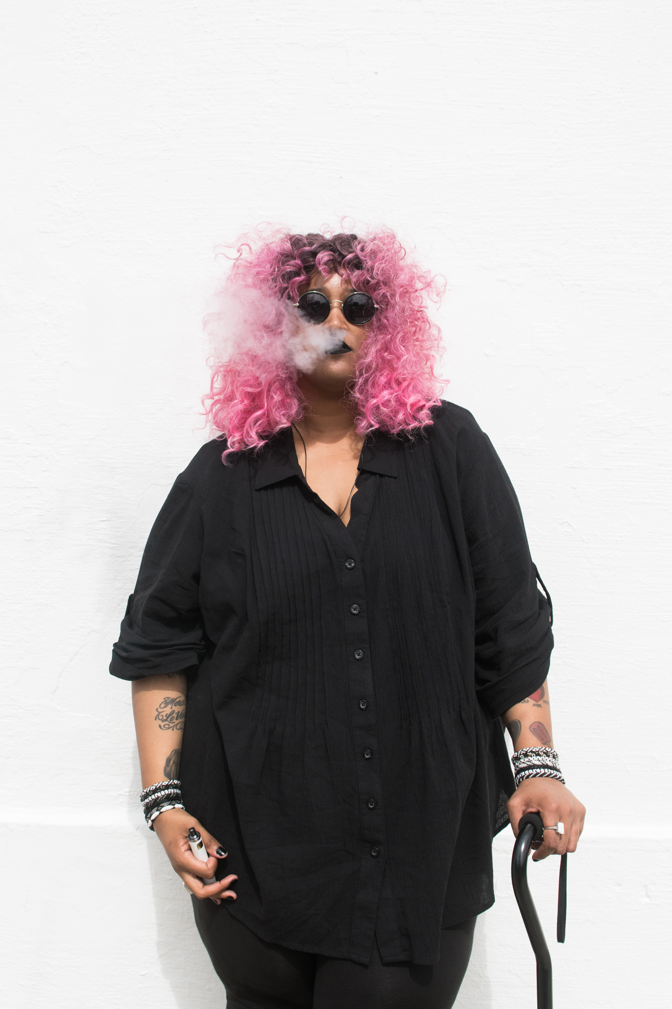 A Black and Indigenous non-binary person looks at the camera while breathing out a semi-transparent cloud of white smoke. She holds a cane in one hand and a vape pen in the other and is sporting pink ombré hair, sunglasses, black lipstick, black nail polish, tattoos, bracelets, a septum ring, and an all-black ensemble.