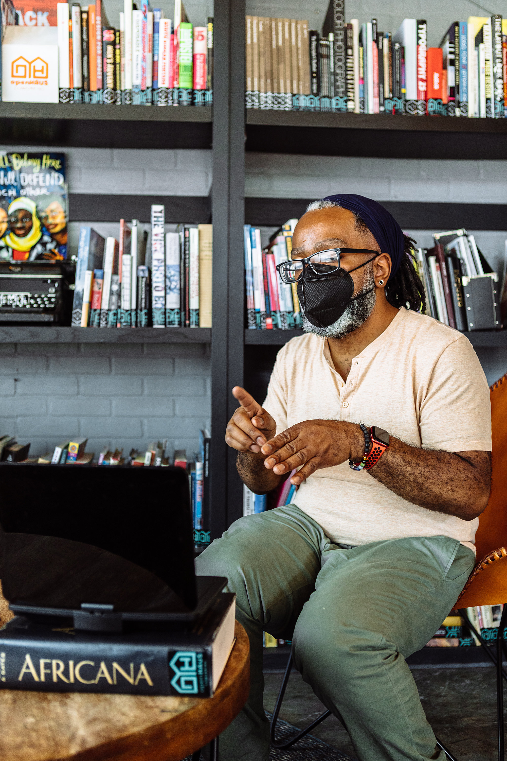 Portrait shot of a Deaf Black man wearing glasses and a KN-95 mask signing in a video chat via laptop. The man sits at a coffee table inside a community library packed with books and posters.