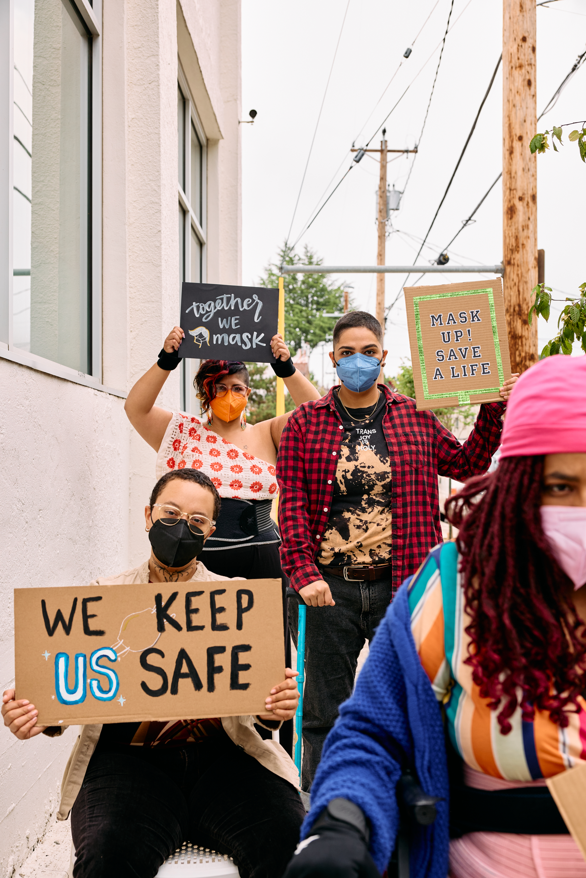 Close-up of four disabled people of color protesting mask bans. At the forefront, a Black protestor is moving out of frame. Behind them, the three remaining protestors hold signs reading, “We keep us safe,” “Together We Mask,” and “Mask up! Save a life.”